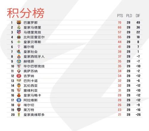 北京时间3月17日凌晨,巴列卡诺1比1战平莱万特,西甲联赛第28轮十场比赛全部结束较量。本轮巴萨5比2大胜塞维利亚,皇马同样4比1轻取埃尔切,目前巴萨积70分继续位列榜首,皇马则积66分排名第2。马德里竞技本轮赢球,1比0击败赫塔费,由于比利亚雷亚尔1比1战平阿拉维斯,马竞独享联赛第3的位置,但排名第4的黄潜已经领先第5的皇家贝蒂斯已经多达11分。
