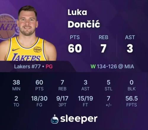 60分更是平了东契奇职业生涯第二高分~