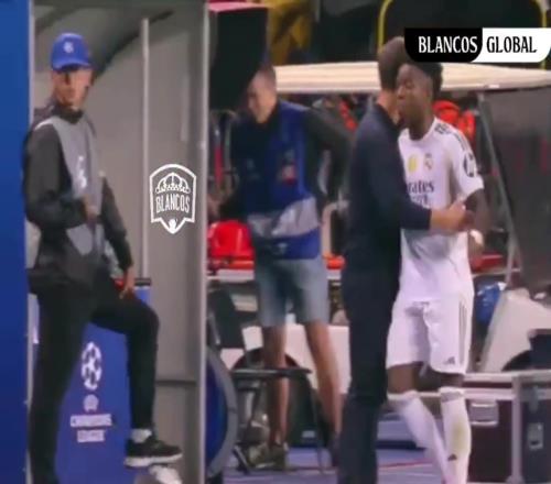 不满马斯坦托诺维尼修斯被换下后一路喋喋不休,贝林厄姆一直劝